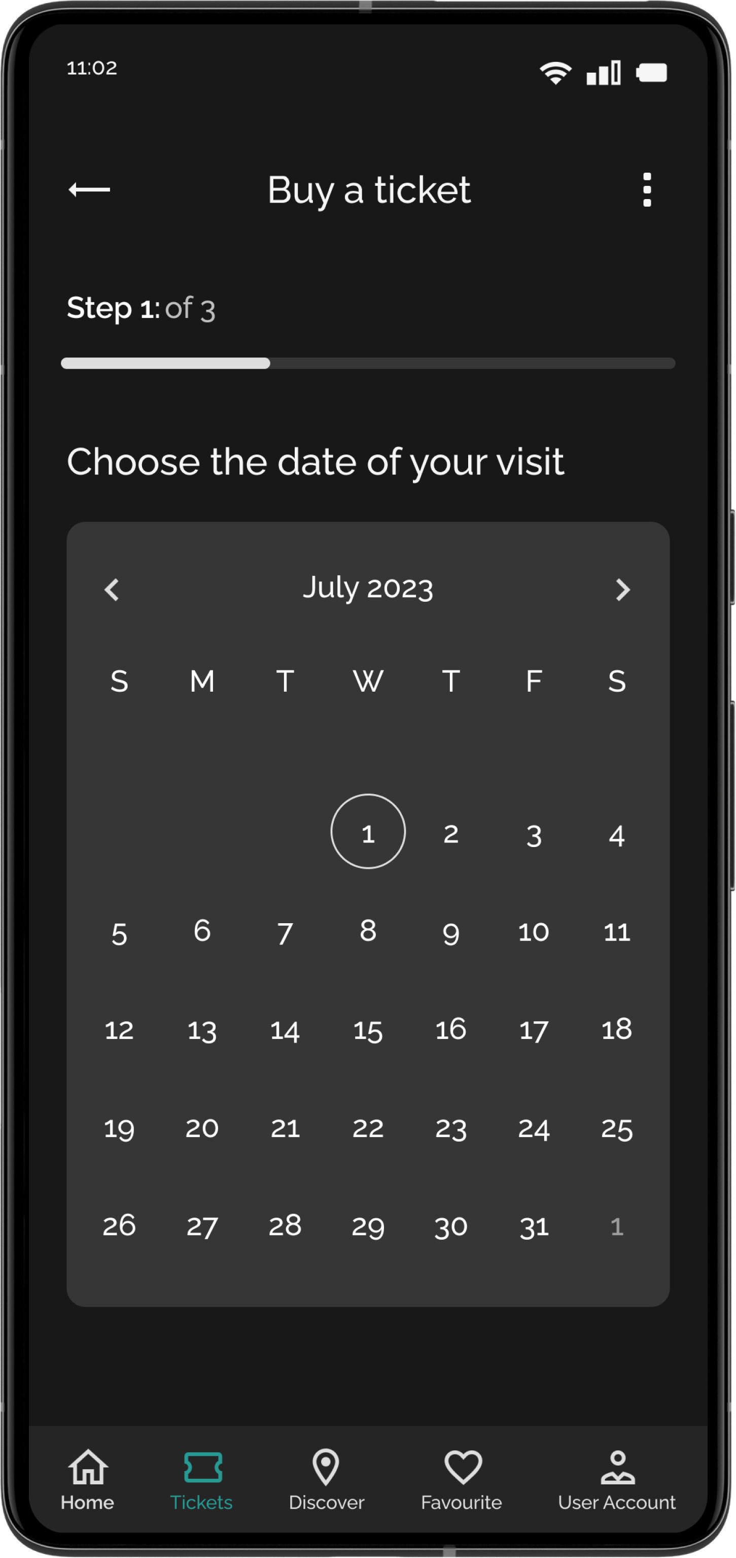 In the app, users can easily buy a ticket to the museum for a chosen day and time. Every step is clearly marked to simplify the process.