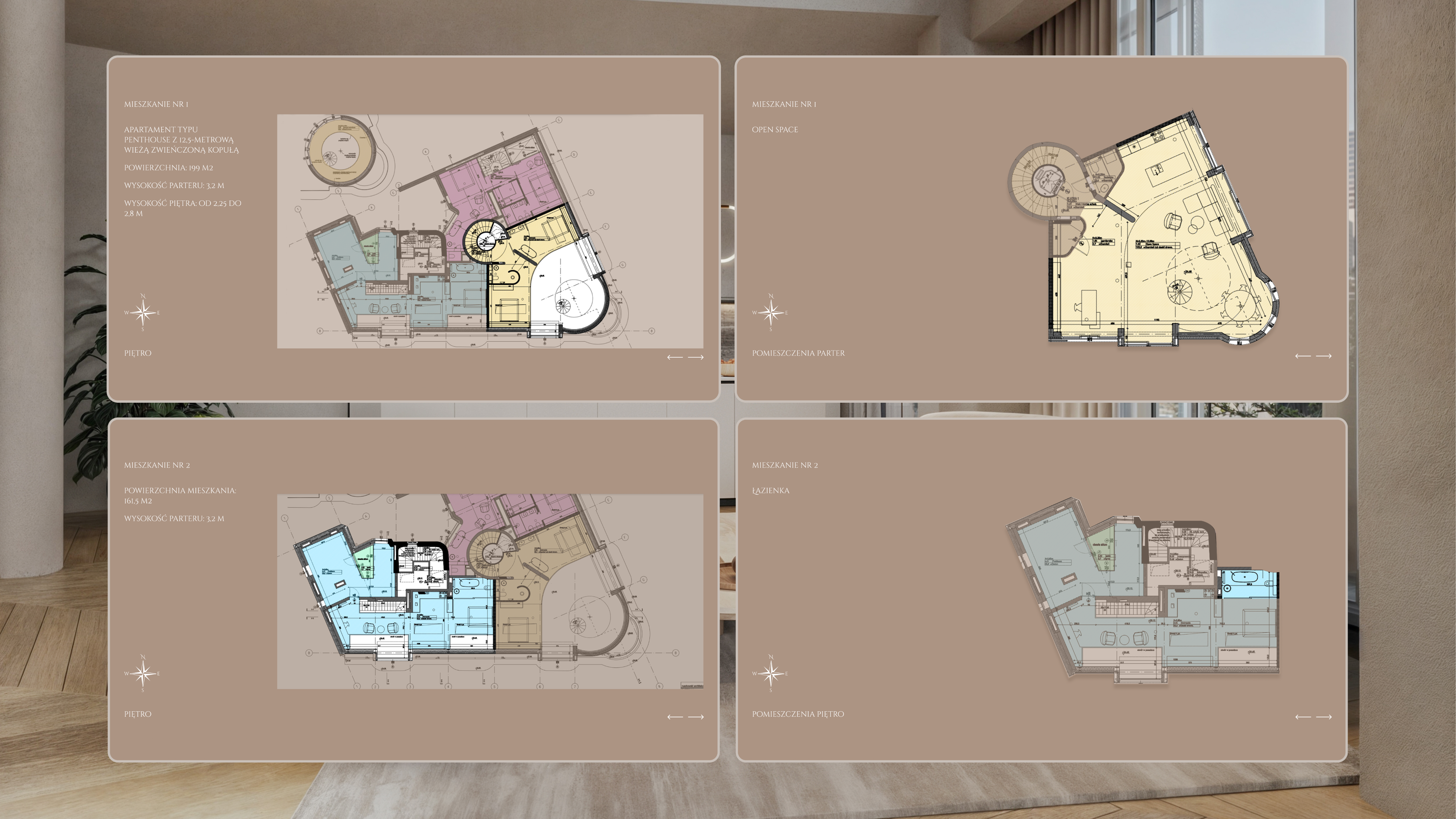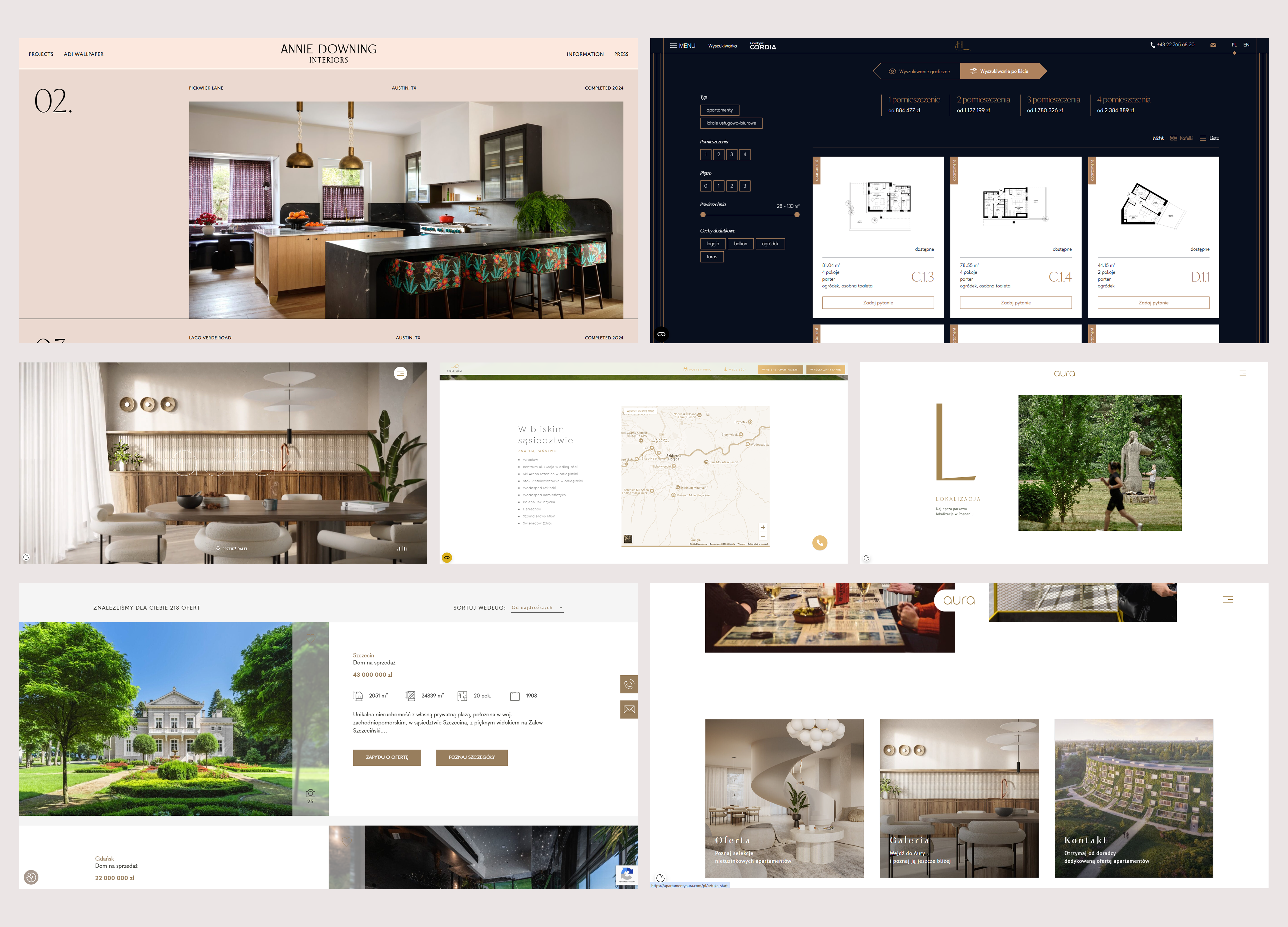 After identifying the client’s needs and the character of the project, I started reviewing websites and sales offers from other companies that specialize in selling luxury apartments. The key features that dominate such projects are simple, elegant design and a minimalist color palette.