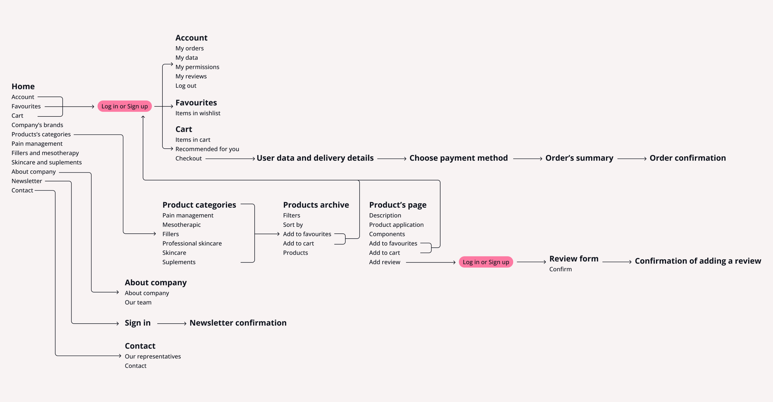 After consulting with a client and analyzing the company’s business interests and potential users’ needs, I create a sitemap for the website. The aim of this step is to construct a logical network for every step of the information architecture.